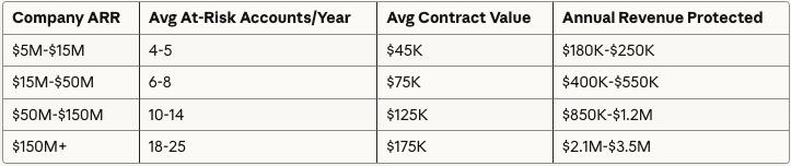 Calculation: 7 at-risk accounts × $75K ARR × 73% save rate × 1.1 (multi-year value) = $421K-$480K