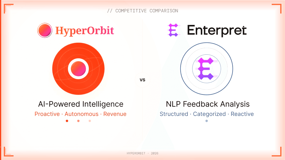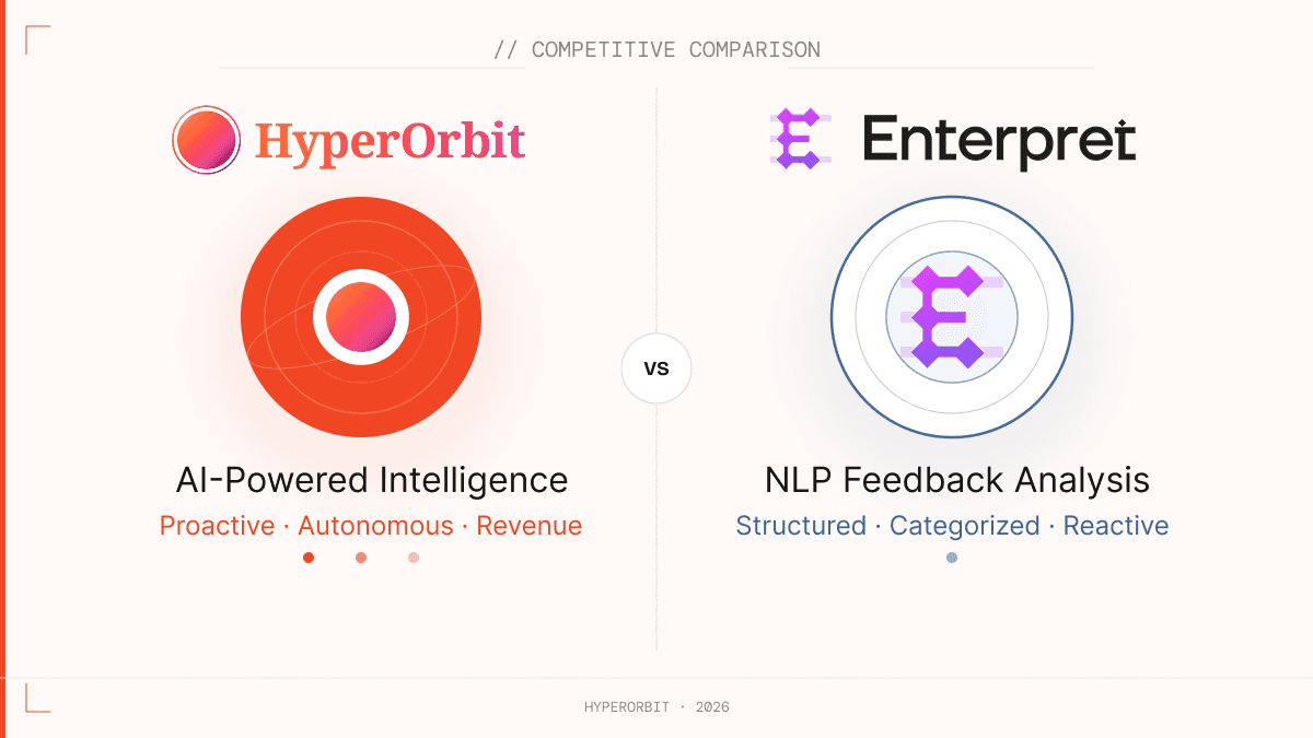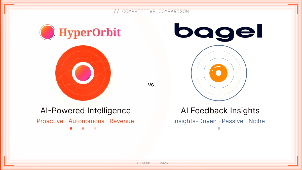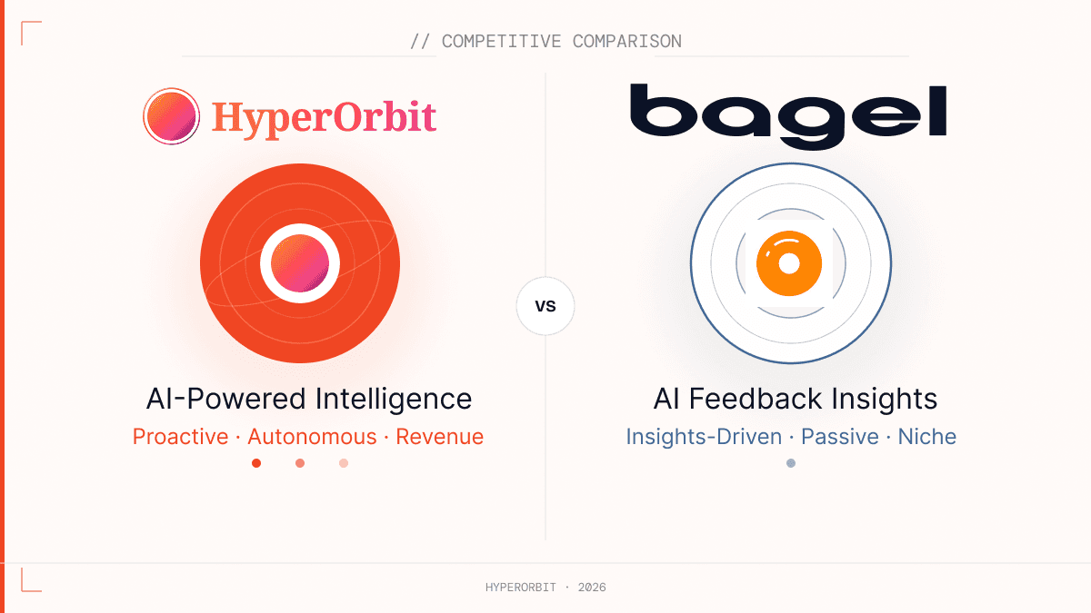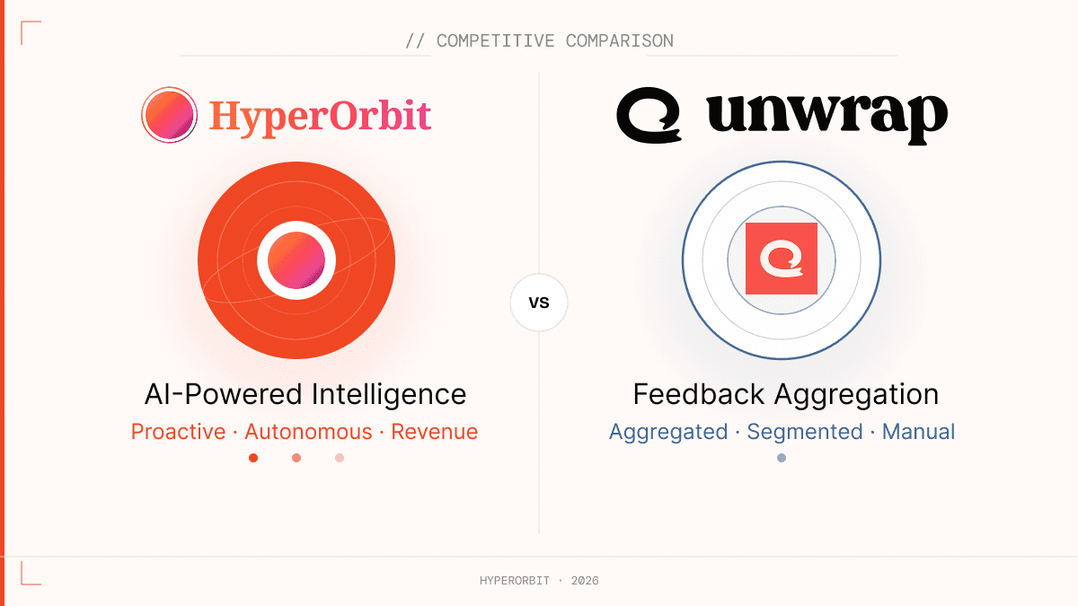 Every tool in this space promises customer intelligence. Most deliver dashboards you have to check, queries you have to run, and reports you have to interpret. HyperOrbit deploys agents that do the work — autonomously, continuously, and tied directly to revenue outcomes. See how we stack up.