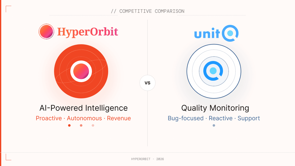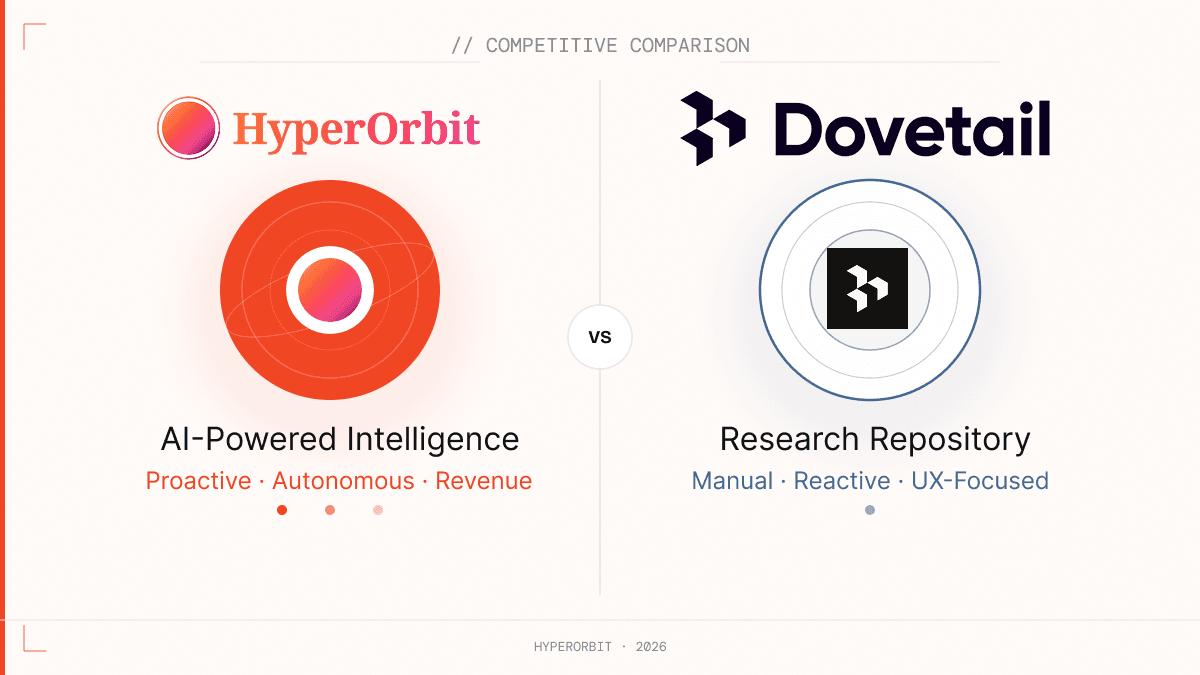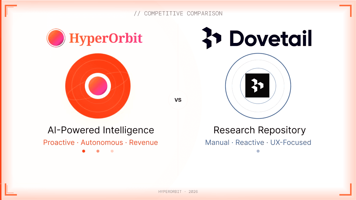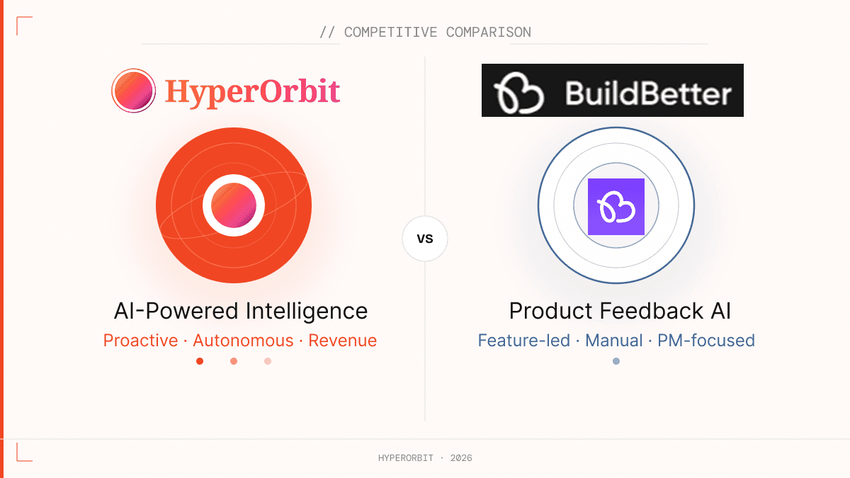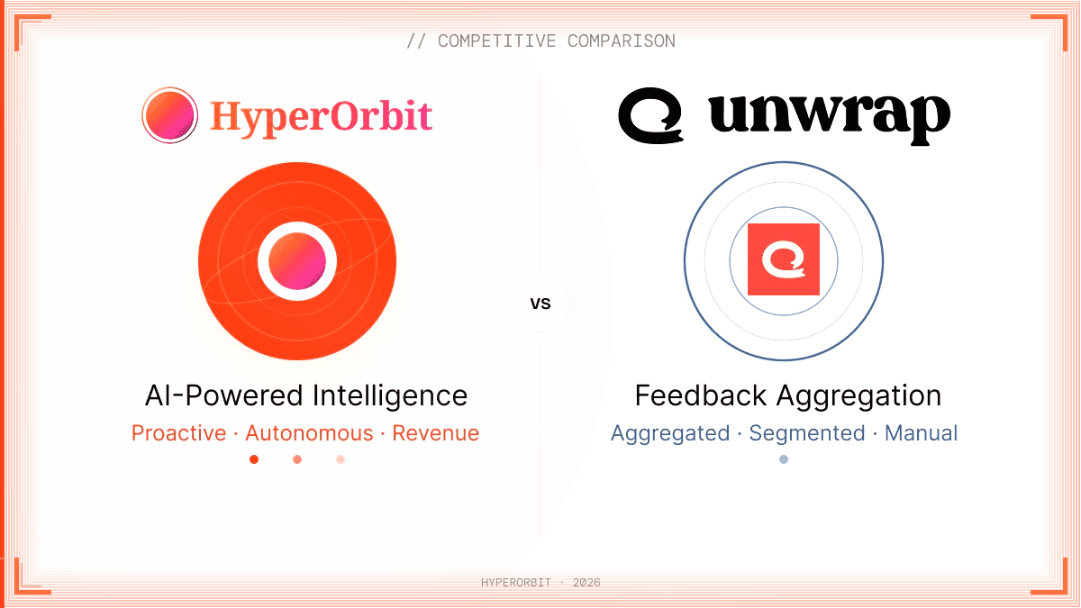 Every tool in this space promises customer intelligence. Most deliver dashboards you have to check, queries you have to run, and reports you have to interpret. HyperOrbit deploys agents that do the work — autonomously, continuously, and tied directly to revenue outcomes. See how we stack up.