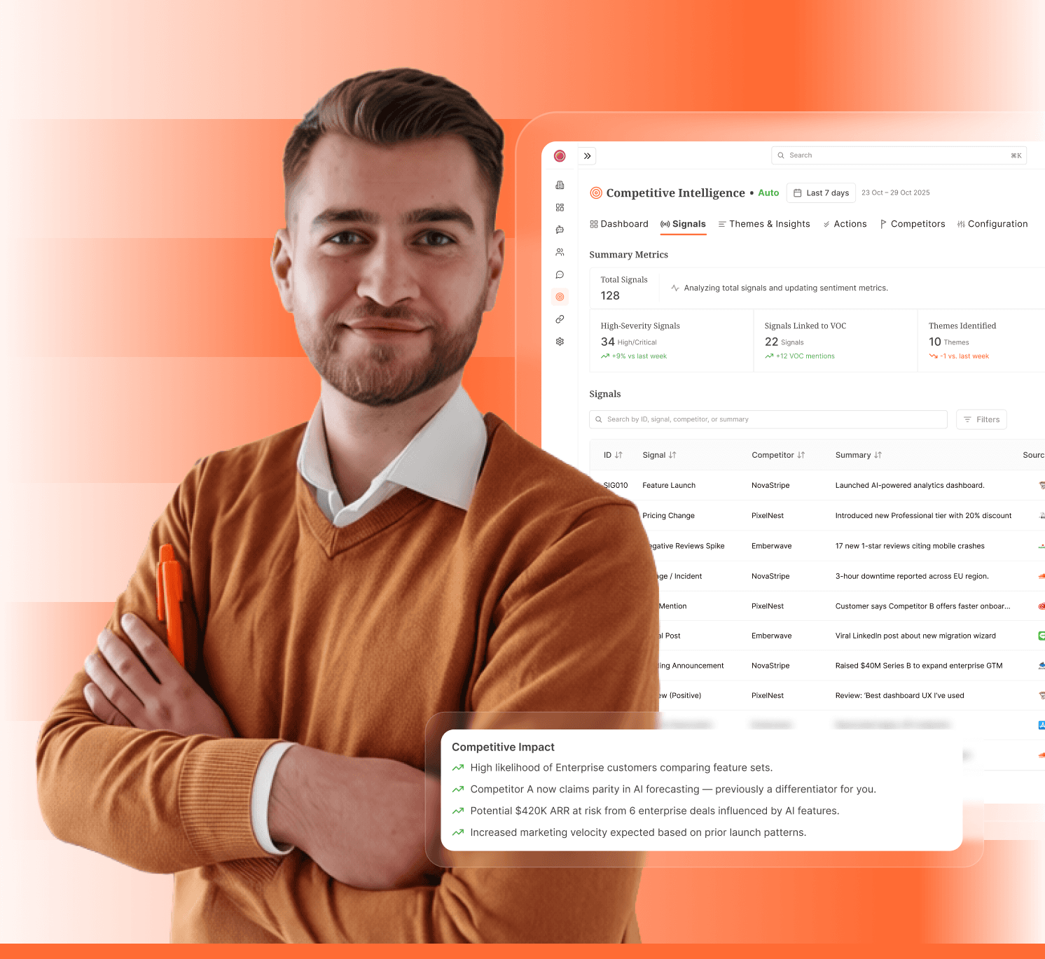 Agent alerts: "Competitor A launched new pricing model—mentioned in 12 customer conversations this week. Investigate impact."